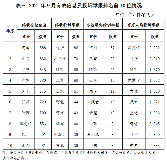 各省(自治區(qū)、直轄市)按照接收的有效信息數(shù)量排序,河南、山東、遼寧、廣東、河北、江蘇、陜西、黑龍江、四川、浙江列全國前10位;按照接收的投訴舉報數(shù)量排序,遼寧、黑龍江、陜西、江蘇、山東、河北、河南、湖南、內(nèi)蒙古、吉林排在全國前10位;按照辦結(jié)屬實的投訴舉報數(shù)量排序,四川、河南、陜西、云南、湖南、內(nèi)蒙古、新疆、山西、黑龍江、山東排在全國前10位;按照百萬人均投訴舉報數(shù)量排序,黑龍江、遼寧、陜西、內(nèi)蒙古、吉林、天津、上海、青海、甘肅、寧夏排在全國前10位。(2021年9月有效信息及投訴舉報排名前10位情況見表三)