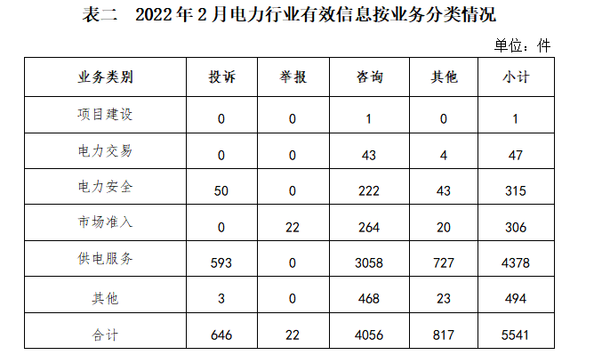 2022年2月,國家能源局12398能源監(jiān)管熱線(以下簡稱12398熱線)共收到有效信息8366件(包含投訴、舉報、咨詢和其他訴求類別),環(huán)比減少30.68%,同比增加10.27%。(2022年2月收到有效信息情況見表一)
