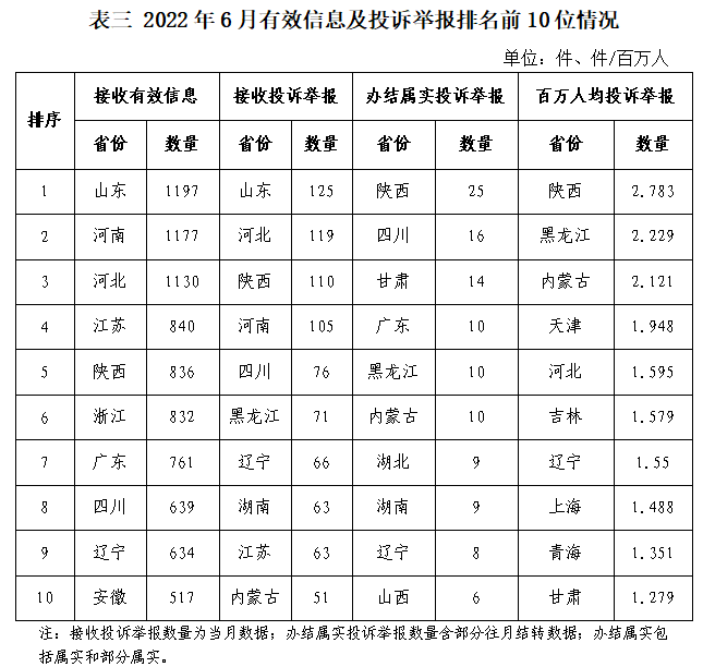 各省(自治區(qū)、直轄市)按照接收的有效信息數(shù)量排序,山東、河南、河北、江蘇、陜西、浙江、廣東、四川、遼寧、安徽排在全國前10位;按照接收的投訴舉報(bào)數(shù)量排序,山東、河北、陜西、河南、四川、黑龍江、遼寧、湖南、江蘇、內(nèi)蒙古排在全國前10位;按照辦結(jié)屬實(shí)的投訴舉報(bào)數(shù)量排序,陜西、四川、甘肅、廣東、黑龍江、內(nèi)蒙古、湖北、湖南、遼寧、山西排在全國前10位;按照百萬人均投訴舉報(bào)數(shù)量排序,陜西、黑龍江、內(nèi)蒙古、天津、河北、吉林、遼寧、上海、青海、甘肅排在全國前10位。(2022年6月有效信息及投訴舉報(bào)排名前10位情況見表三)