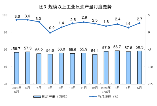 原油生產(chǎn)有所加快,進(jìn)口由降轉(zhuǎn)增。5月份,生產(chǎn)原油1807萬噸,同比增長2.7%,增速比4月份加快1.3個(gè)百分點(diǎn),日均產(chǎn)量58.3萬噸。進(jìn)口原油5144萬噸,同比增長12.3%,4月份為下降1.4%。