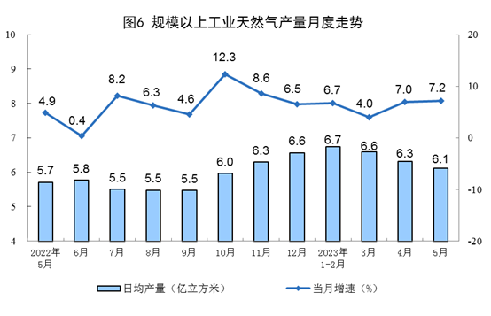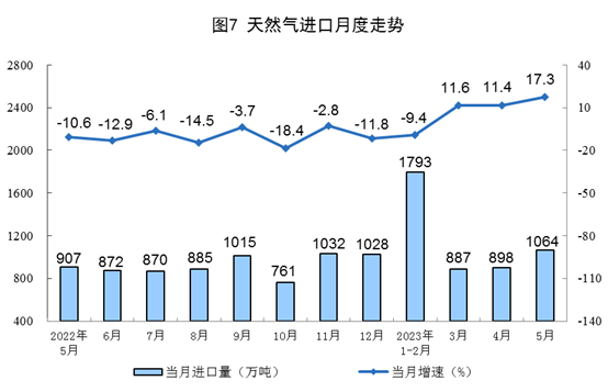 天然氣生產(chǎn)穩(wěn)步增長,進(jìn)口增速加快。5月份,生產(chǎn)天然氣190億立方米,同比增長7.2%,增速比4月份加快0.2個(gè)百分點(diǎn),日均產(chǎn)量6.1億立方米。進(jìn)口天然氣1064萬噸,同比增長17.3%,增速比4月份加快5.9個(gè)百分點(diǎn)。