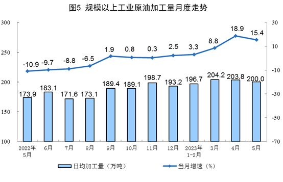 原油加工保持較快增長,增速有所回落。5月份,加工原油6200萬噸,同比增長15.4%,增速比4月份回落3.5個(gè)百分點(diǎn),日均加工原油200.0萬噸。1—5月份,加工原油30263萬噸,同比增長9.8%。