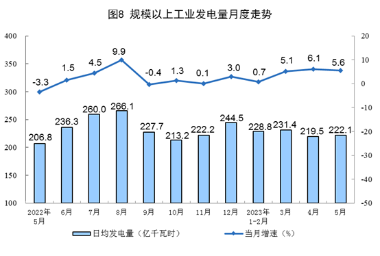 電力生產(chǎn)增速略有回落。5月份,發(fā)電6886億千瓦時(shí),同比增長5.6%,增速比4月份回落0.5個(gè)百分點(diǎn),日均發(fā)電222.1億千瓦時(shí)。1—5月份,發(fā)電34216億千瓦時(shí),同比增長3.9%。
