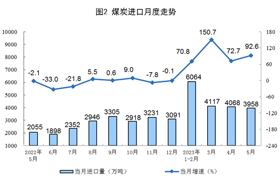 原煤生產(chǎn)保持穩(wěn)定,進(jìn)口持續(xù)高位增長。5月份,生產(chǎn)原煤3.9億噸,同比增長4.2%,增速比4月份放緩0.3個(gè)百分點(diǎn),日均產(chǎn)量1243萬噸。進(jìn)口煤炭3958萬噸,同比增長92.6%,增速比4月份加快19.9個(gè)百分點(diǎn)。