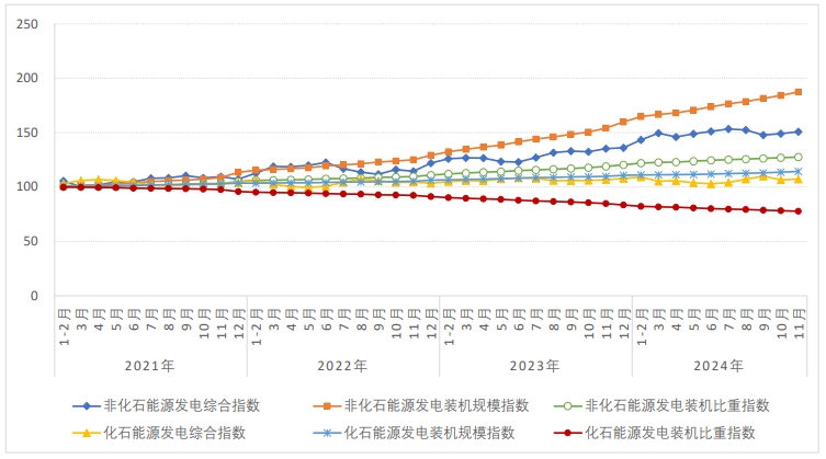 非化石能源發(fā)電量規(guī)模指數(shù)為145.3,比2020年基期增長了45.3%,年均增長9.8%,同比增長5.6%。非化石能源發(fā)電量比重指數(shù)為112.1,比2020年基期比重提升了12.1%。