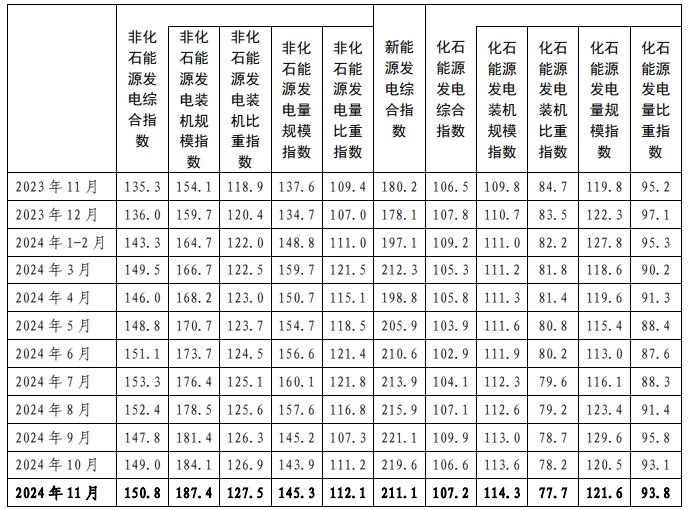 2024年11月,非化石能源發(fā)電綜合指數(shù)為150.8,比2020年基期增長了50.8%,同比增長11.5%;其中,新能源發(fā)電綜合指數(shù)為211.1,比2020年基期增長了111.1%,同比增長17.1%。在“雙碳”目標(biāo)引領(lǐng)下,非化石能源及其新能源發(fā)電綜合指數(shù)保持快速增長態(tài)勢。其中: