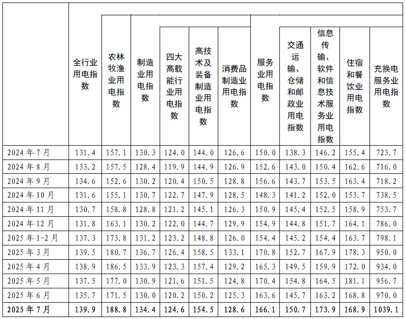 2025年7月,全國全行業(yè)用電指數(shù)為139.9,全行業(yè)用電量比2020年基期(以2020年基期為100)增長了39.9%,年均增長6.9%,同比增長6.5%,增速比上月提高1.9個(gè)百分點(diǎn)。