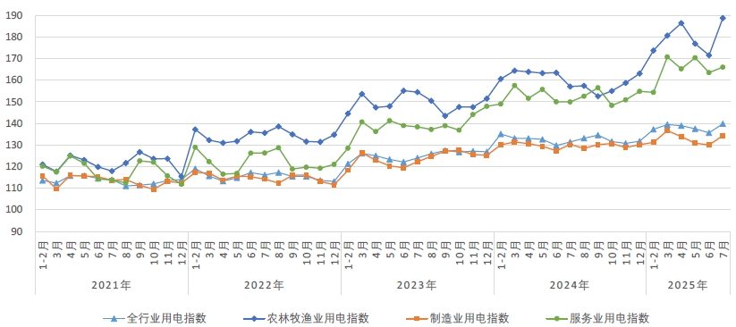 7月,農(nóng)林牧漁業(yè)用電指數(shù)為188.8,比2020年基期增長了88.8%,年均增長13.6%,同比增長20.2%。