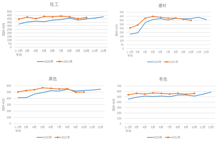 1-10月,化工行業(yè)用電量4156億千瓦時,同比增長8.1%,增速比上年同期提高7.7個百分點;建材行業(yè)用電量3434億千瓦時,同比增長10.0%,增速比上年同期提高7.5個百分點;黑色金屬冶煉行業(yè)用電量5302億千瓦時,同比增長8.8%,增速比上年同期提高5.6個百分點;有色金屬冶煉行業(yè)用電量5558億千瓦時,同比增長7.2%,增速比上年同期提高3.6個百分點。