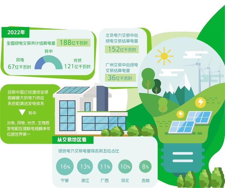 在政策推動下,綠電交易規(guī)模進(jìn)一步擴大。國網(wǎng)能源研究院數(shù)據(jù)顯示,2022年,全國綠電交易共計結(jié)算電量188億千瓦時。其中,風(fēng)電67億千瓦時,光伏121億千瓦時。北京電力交易中心綠電交易結(jié)算電量152億千瓦時,廣州交易中心綠電交易結(jié)算電量36億千瓦時。從交易地區(qū)看,綠色電力交易電量排名前五位的是寧夏、浙江、廣西、河北、吉林,占綠色電力交易總電量的16%、13%、11%、10%、8%。