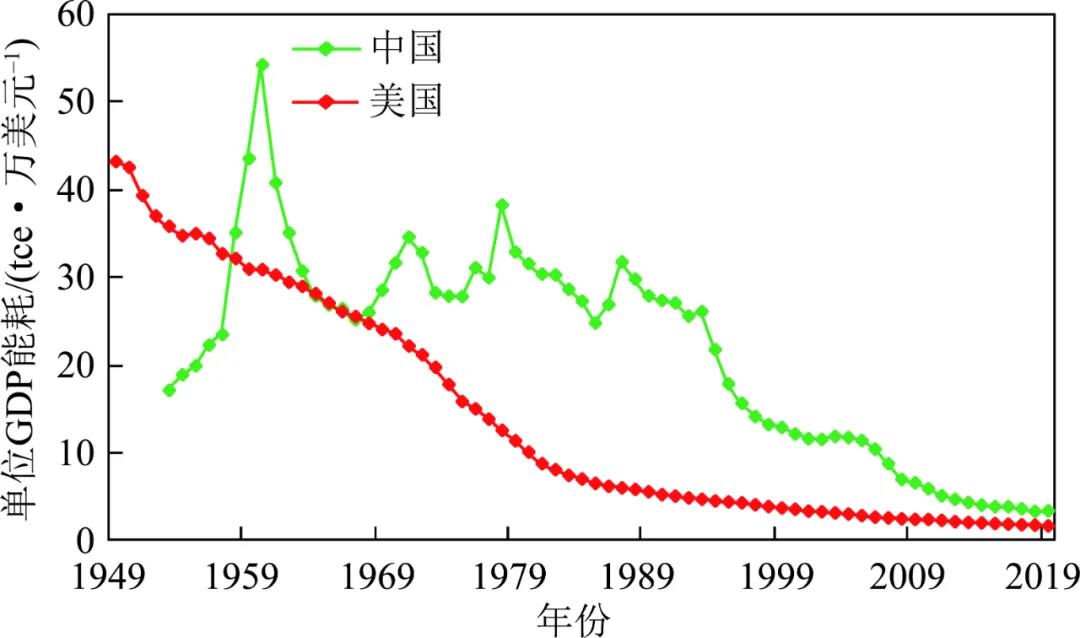 美國(guó)能源消費(fèi)碳排放強(qiáng)度在碳達(dá)峰前期、達(dá)峰期下降幅度較小,實(shí)現(xiàn)碳達(dá)峰核心是提高能源效率,降低單位GDP能耗,在不大幅度增加能源消費(fèi)的前提下,支撐經(jīng)濟(jì)增長(zhǎng)。2019年美國(guó)單位GDP能耗僅相當(dāng)于1949年的3.9%。