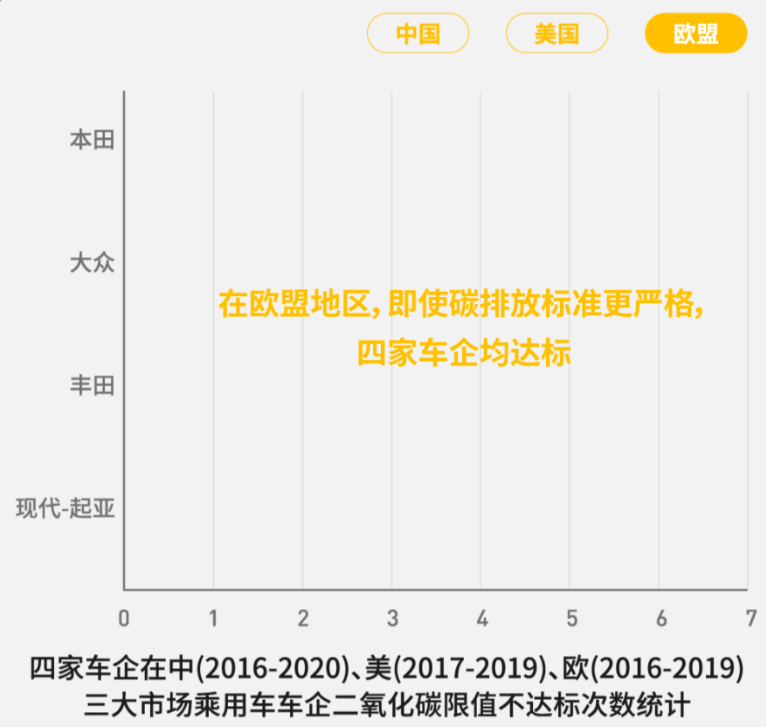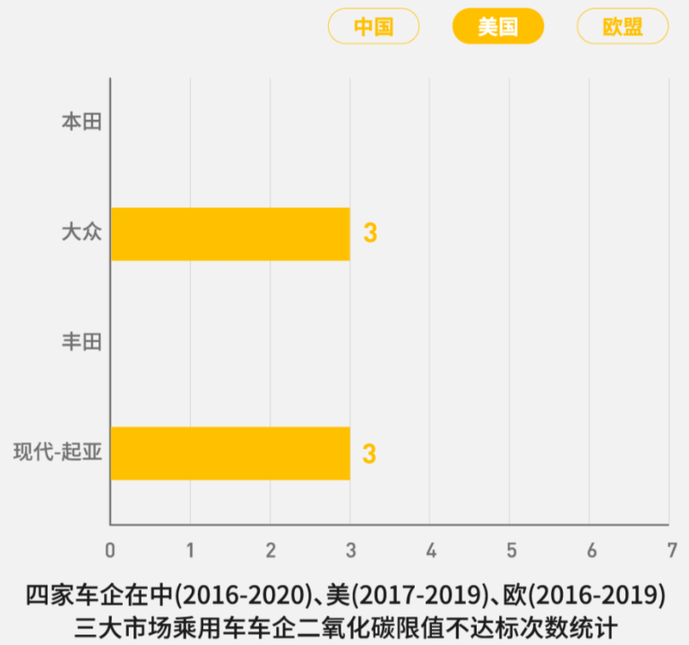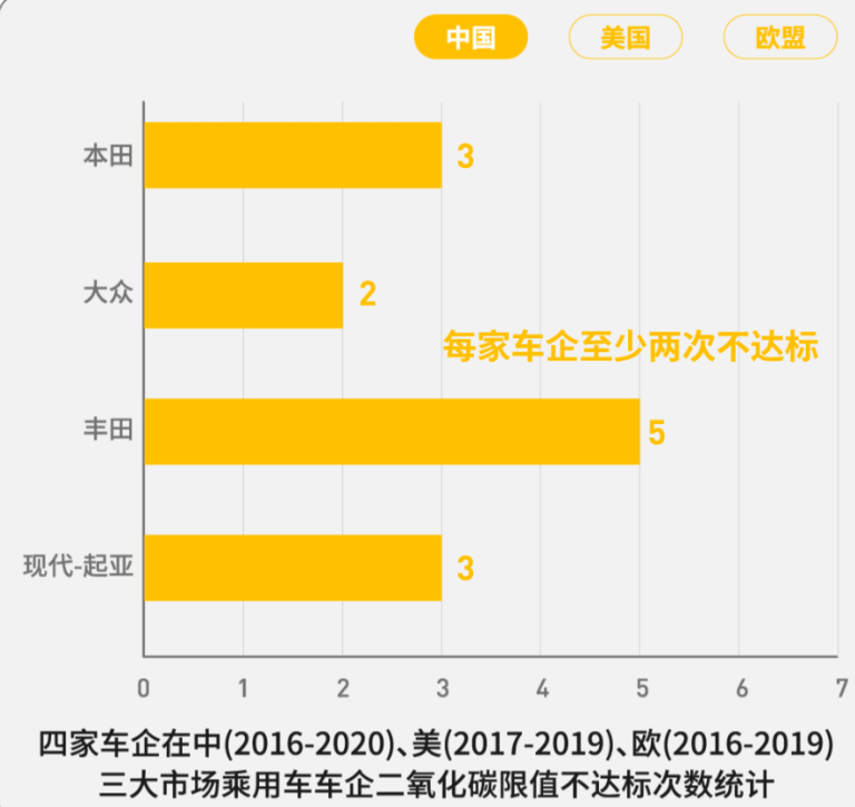 報(bào)告數(shù)據(jù)顯示,2016-2020年間,四家車企在中國均至少有兩次不達(dá)標(biāo),其中豐田五次不達(dá)標(biāo),本田與現(xiàn)代-起亞三次不達(dá)標(biāo),大眾則有兩次。