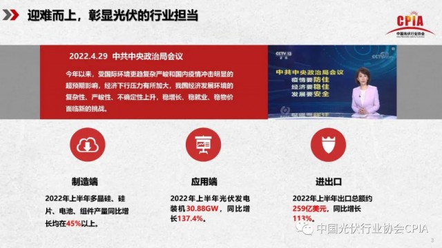 2022年7月21日,由中國光伏行業(yè)協(xié)會(huì)主辦的“光伏行業(yè)2022年上半年發(fā)展回顧與下半年形勢展望研討會(huì)”采用線上直播形式順利召開。中國光伏行業(yè)協(xié)會(huì)名譽(yù)理事長王勃華出席會(huì)議并作“2022年光伏行業(yè)上半年發(fā)展回顧與下半年形勢展望”報(bào)告。