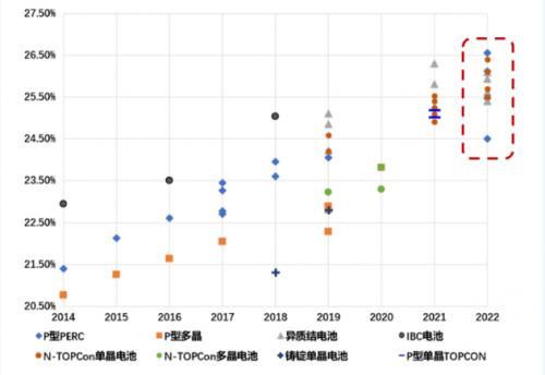 在內(nèi)外部環(huán)境的共同推動(dòng)下,我國(guó)光伏企業(yè)加大工藝技術(shù)研發(fā)力度,生產(chǎn)工藝水平不斷進(jìn)步,不斷刷新紀(jì)錄。據(jù)中國(guó)光伏行業(yè)協(xié)會(huì)統(tǒng)計(jì),2014—2022年,我國(guó)企業(yè)、研究機(jī)構(gòu)晶硅電池實(shí)驗(yàn)室效率共打破世界紀(jì)錄56次;2022年,刷新效率紀(jì)錄14次,其中10次為n型電池技術(shù)。未來(lái)隨著生產(chǎn)成本的降低及良率的提升,n型電池將會(huì)成為電池技術(shù)的主要發(fā)展方向之一。