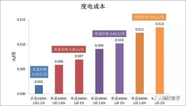 當(dāng)單晶的初始光衰為2%,單晶組件價(jià)格必須低于多晶0.01元/瓦,任何超出以上價(jià)差范圍(-0.01元~+0.02元/瓦)的單晶組件,將導(dǎo)致單晶光伏電站系統(tǒng)的度電成本高出多晶光伏電站系統(tǒng),降低了太陽能電站的投資回報(bào)率。