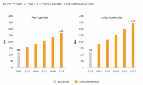 在全球范圍內(nèi),預(yù)計(jì)在2023年安裝的公用事業(yè)規(guī)模光伏系統(tǒng)裝機(jī)容量將達(dá)到182GW,與2022年相比增長51%。預(yù)計(jì)2024年為218GW,到2027年預(yù)計(jì)將進(jìn)一步增長至349GW。