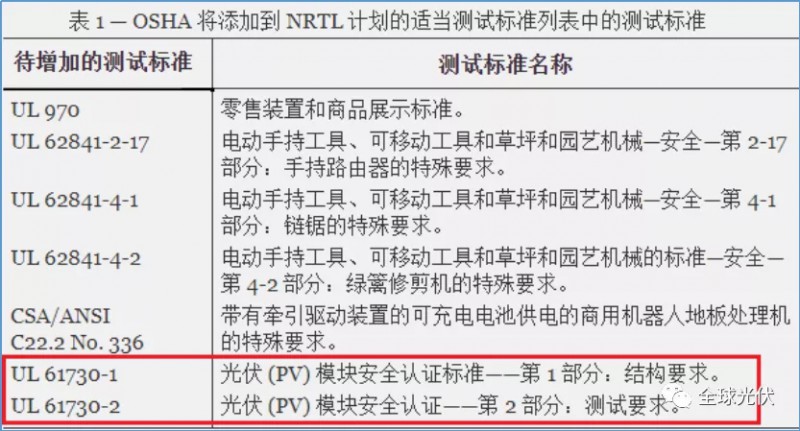 OSHA 于 2021 年 8 月 16 日發(fā)布通知,宣布修改 NRTL 計(jì)劃的適當(dāng)測試標(biāo)準(zhǔn)清單和認(rèn)可范圍的提案 ( 86 FR 45755 )。其中和光伏產(chǎn)品相關(guān)的是光伏組件的安全認(rèn)證標(biāo)準(zhǔn)。