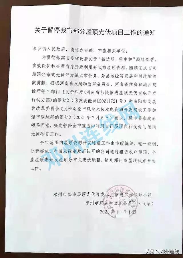 近日,有網(wǎng)友爆料稱,河南省鄧州市以整市屋頂光伏開發(fā)試點(diǎn)推進(jìn)工作領(lǐng)導(dǎo)小組、市發(fā)改委的名義印發(fā)通知,暫停全市范圍內(nèi)利用自己屋頂自行投資的屋頂光伏項(xiàng)目工作。