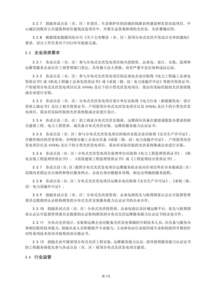 各試點(diǎn)縣(市、區(qū))的工商業(yè)分布式光伏安裝商、運(yùn)維商應(yīng)具備住建部或能監(jiān)辦要求的相關(guān)建筑工程、電力工程資質(zhì),或具備分布式光伏安裝、運(yùn)維的服務(wù)能力認(rèn)證證書。