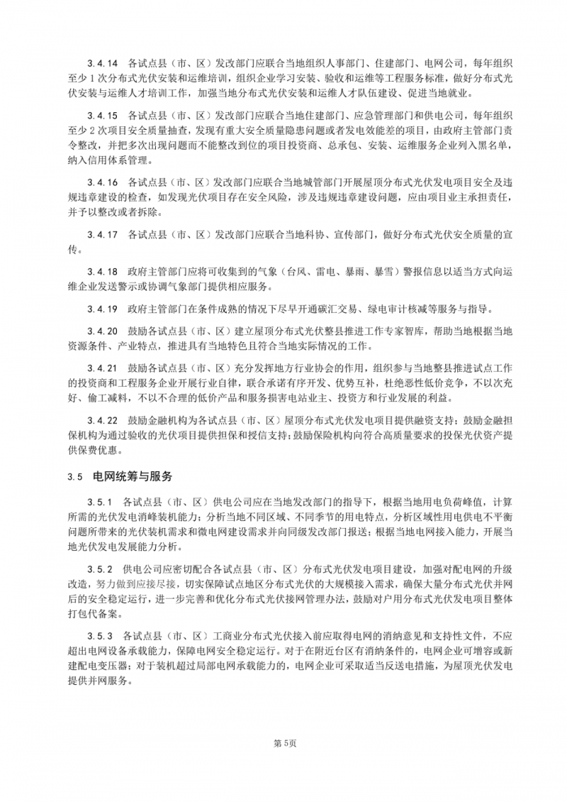 各試點(diǎn)縣(市、區(qū))應(yīng)成立整縣推進(jìn)試點(diǎn)工作專班,在屋頂資源管理、項(xiàng)目招標(biāo)、項(xiàng)目融資和并網(wǎng)、電費(fèi)結(jié)算等方面加強(qiáng)統(tǒng)籌協(xié)調(diào),并加強(qiáng)事中事后監(jiān)管。