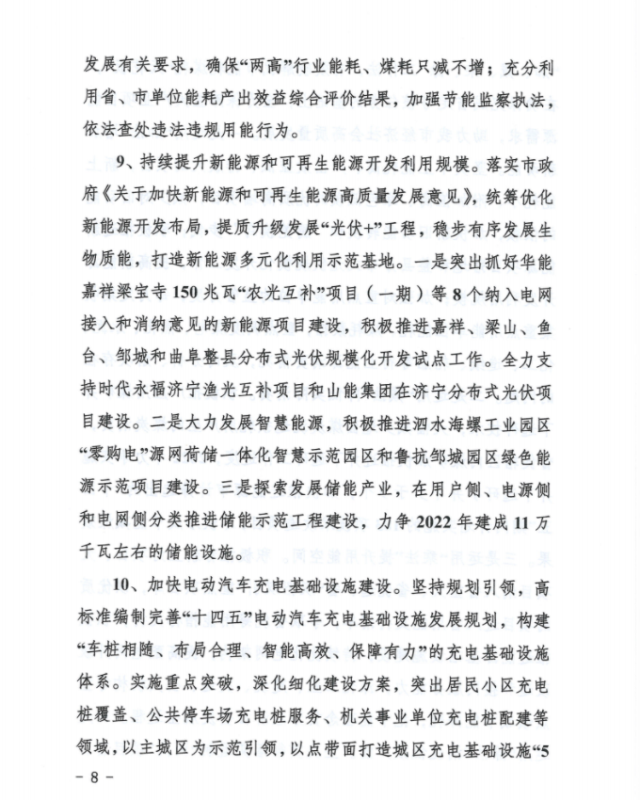 持續(xù)提升新能源和可再生能源開(kāi)發(fā)利用規(guī)模。落實(shí)市政府《關(guān)于加快新能源和可再生能源高質(zhì)量發(fā)展意見(jiàn)》,統(tǒng)籌優(yōu)化新能源開(kāi)發(fā)布局,提質(zhì)升級(jí)發(fā)展“光伏+”工程,穩(wěn)步有序發(fā)展生物質(zhì)能,打造新能源多元化利用示范基地。一是突出抓好華能嘉祥梁寶寺150兆瓦“農(nóng)光互補(bǔ)”項(xiàng)目(一期)等8個(gè)納入電網(wǎng)接入和消納意見(jiàn)的新能源項(xiàng)目建設(shè),積極推進(jìn)嘉祥、梁山、魚(yú)臺(tái)、鄒城和曲阜整縣分布式光伏規(guī)?;_(kāi)發(fā)試點(diǎn)工作。全力支持時(shí)代永福濟(jì)寧漁光互補(bǔ)項(xiàng)目和山能集團(tuán)在濟(jì)寧分布式光伏項(xiàng)目建設(shè)。二是大力發(fā)展智慧能源,積極推進(jìn)泗水海螺工業(yè)園區(qū)“零購(gòu)電”源網(wǎng)荷儲(chǔ)一體化智慧示范園區(qū)和魯抗鄒城園區(qū)綠色能源示范項(xiàng)目建設(shè)。三是探索發(fā)展儲(chǔ)能產(chǎn)業(yè),在用戶側(cè)、電源側(cè)和電網(wǎng)側(cè)分類推進(jìn)儲(chǔ)能示范工程建設(shè),力爭(zhēng)2022年建成11萬(wàn)千瓦左右的儲(chǔ)能設(shè)施。