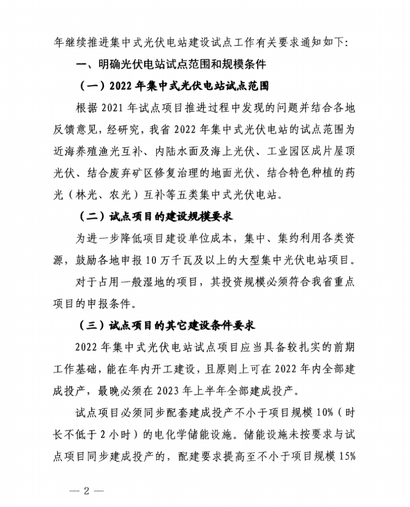 同步配套建成投產不小于項目規(guī)模10%(時長不低于2小時)的電化學儲能設施。儲能設施未按要求與試點項目同步建成投產的,配建要求提高至不小于項目規(guī)模15%(時長不低于4小時)。