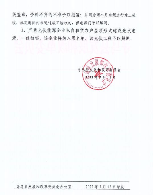 近日,江西省贛州市尋烏縣發(fā)改委印發(fā)《關于規(guī)范戶用分布式光伏發(fā)電項目建設的補充通知》,通知明確提出嚴禁光伏能源企業(yè)私自租賃農戶屋頂形式建設光伏電源。一經(jīng)核實,該企業(yè)將納入黑名單,該光伏工程予以解網(wǎng)。
