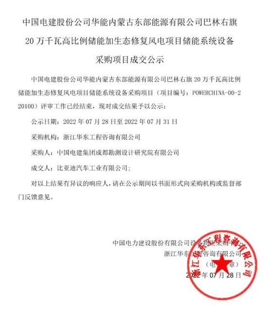 近日,中國電建集中采購平臺發(fā)布《中國電建股份公司華能內蒙古東部能源有限公司巴林右旗20萬千瓦高比例儲能加生態(tài)修復風電項目儲能系統(tǒng)設備采購項目成交公示》的公告。