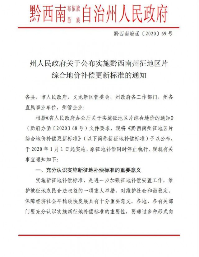 根據(jù)《州人民政府關于公布實施黔西南州征地區(qū)片綜合地價補償更新標準的通知》(黔西南府函〔2020〕69號)補償標準執(zhí)行。