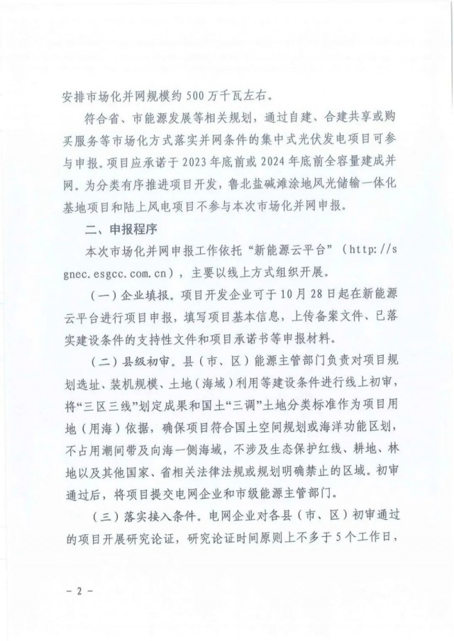 根據(jù)文件,綜合考慮可再生能源電力消納責(zé)任權(quán)重,2022年全省安排市場化并網(wǎng)規(guī)模約500萬千瓦左右,本批項(xiàng)目應(yīng)承諾于2023年底前或2024年底前全容量建成并網(wǎng)。另外,魯北鹽堿灘涂地風(fēng)光儲(chǔ)輸一體化基地項(xiàng)目和陸上風(fēng)電項(xiàng)目不參與本次市場化并網(wǎng)申報(bào)。