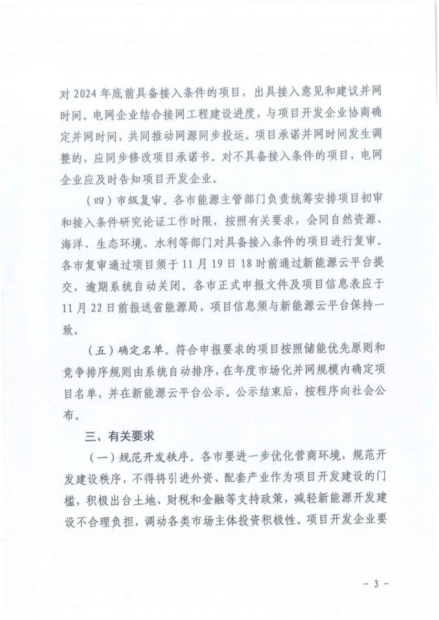 (四)市級復(fù)審。各市能源主管部門負(fù)責(zé)統(tǒng)籌安排項(xiàng)目初審和接入條件研究論證工作時(shí)限,按照有關(guān)要求,會(huì)同自然資源、海洋、生態(tài)環(huán)境、水利等部門對具備接入條件的項(xiàng)目進(jìn)行復(fù)審。各市復(fù)審?fù)ㄟ^項(xiàng)目須于11月19日18時(shí)前通過新能源云平臺(tái)提交,逾期系統(tǒng)自動(dòng)關(guān)閉。各市正式申報(bào)文件及項(xiàng)目信息表應(yīng)于11月22日前報(bào)送省能源局,項(xiàng)目信息須與新能源云平臺(tái)保持一致。