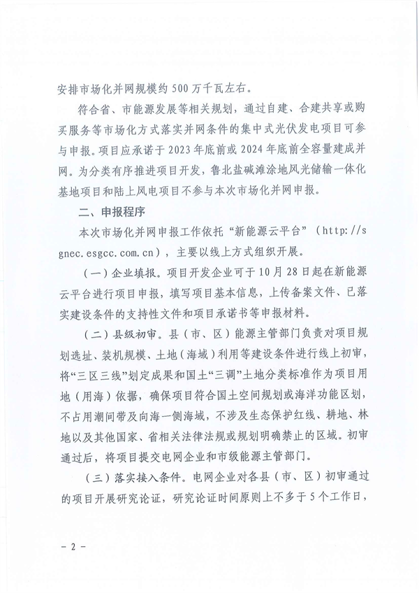 符合省、市能源發(fā)展等相關(guān)規(guī)劃,通過自建、合建共享或購買服務(wù)等市場化方式落實(shí)并網(wǎng)條件的集中式光伏發(fā)電項(xiàng)目可參與申報(bào)。項(xiàng)目應(yīng)承諾于2023年底前或2024年底前全容量建成并網(wǎng)。為分類有序推進(jìn)項(xiàng)目開發(fā),魯北鹽堿灘涂地風(fēng)光儲(chǔ)輸一體化基地項(xiàng)目和陸上風(fēng)電項(xiàng)目不參與本次市場化并網(wǎng)申報(bào)。