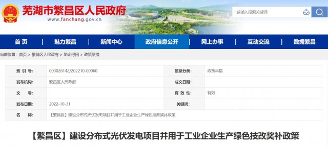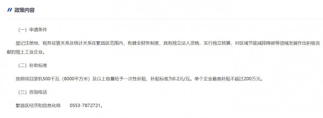 10月31日,安徽省蕪湖市繁昌區(qū)發(fā)布《建設(shè)分布式光伏發(fā)電項目并用于工業(yè)企業(yè)生產(chǎn)綠色技改獎補政策》,對“登記注冊地、稅務(wù)征管關(guān)系及統(tǒng)計關(guān)系在繁昌區(qū)范圍內(nèi),有健全財務(wù)制度、具有獨立法人資格、實行獨立核算,對區(qū)域節(jié)能減排降碳等領(lǐng)域發(fā)展作出積極貢獻的規(guī)上工業(yè)企業(yè)”進行政策獎補。