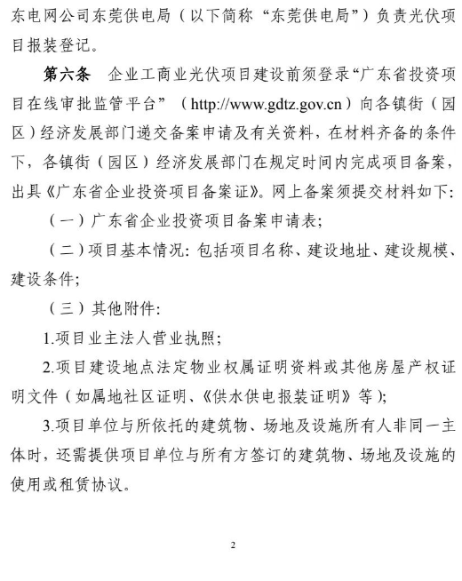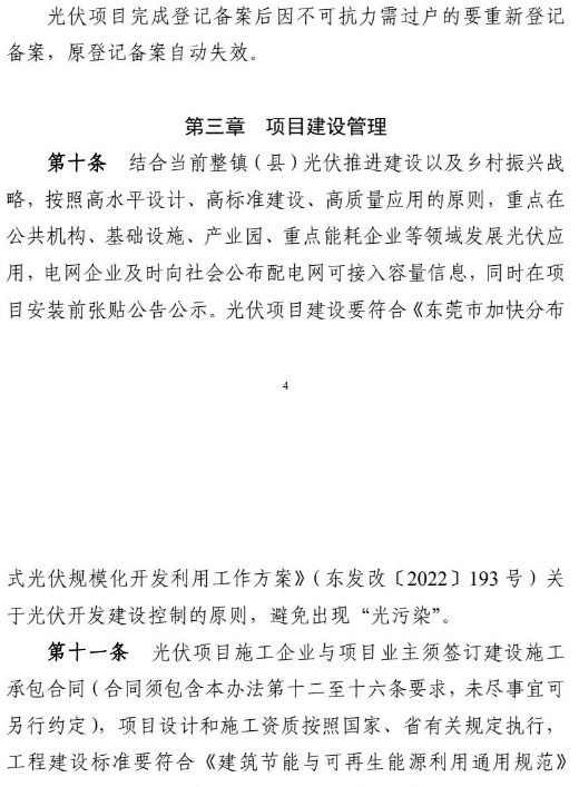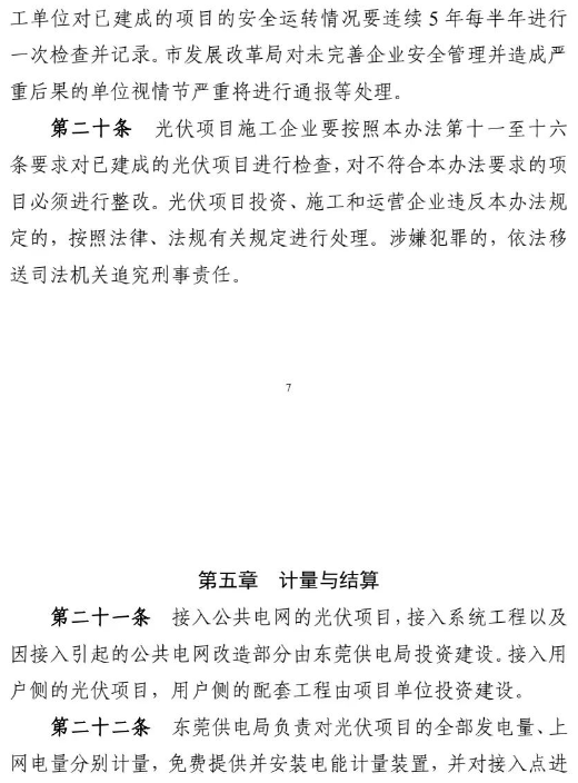 近日,東莞市發(fā)改委印發(fā)《東莞市發(fā)展和改革局分布式光伏發(fā)電項(xiàng)目建設(shè)管理辦法》的通知。在通知中提出:光伏項(xiàng)目建設(shè)采用的光伏支架要采用防腐防銹材質(zhì),材質(zhì)符合《太陽(yáng)能光伏系統(tǒng)支架通用技術(shù)要求JG/T490》,光伏支架風(fēng)力荷載與重力荷載等級(jí)符合國(guó)家鋼結(jié)構(gòu)工程施工質(zhì)量驗(yàn)收規(guī)范(GB 50205),平面屋頂項(xiàng)目光伏組件最高點(diǎn)距離鋪設(shè)平面的高度不得高于2.8米,具有樓梯間的居民樓項(xiàng)目光伏組件不高于樓梯間屋面1米(最高點(diǎn)應(yīng)不高于頂屋屋面4米),并且四周均不得圍蔽形成建筑使用空間。