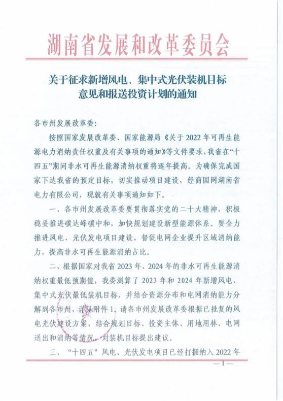 11月10日,湖南省發(fā)改委下發(fā)《關(guān)于征求新增風(fēng)電、集中式光伏裝機(jī)目標(biāo)意見(jiàn)和報(bào)送投資計(jì)劃的通知》?!锻ㄖ分赋?,根據(jù)國(guó)家對(duì)湖南省2023年、2024年的非水可再生能源消納權(quán)重最低預(yù)期值,湖南發(fā)改委測(cè)算了2023年和2024年新增風(fēng)電、集中式光伏最低裝機(jī)目標(biāo),并結(jié)合資源分布和電網(wǎng)消納能力分解到各市州。其中,2023年湖南新增風(fēng)電規(guī)模為225萬(wàn)千瓦,新增光伏裝機(jī)規(guī)模為340萬(wàn)千瓦;2024年湖南新增風(fēng)電規(guī)模為330萬(wàn)千瓦,新增光伏裝機(jī)規(guī)模為300萬(wàn)千瓦。