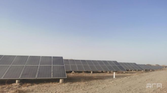 光伏電池板“匍匐”在塔克拉瑪干沙漠的邊緣(央廣網(wǎng)發(fā) 墨玉縣融媒體中心供圖)