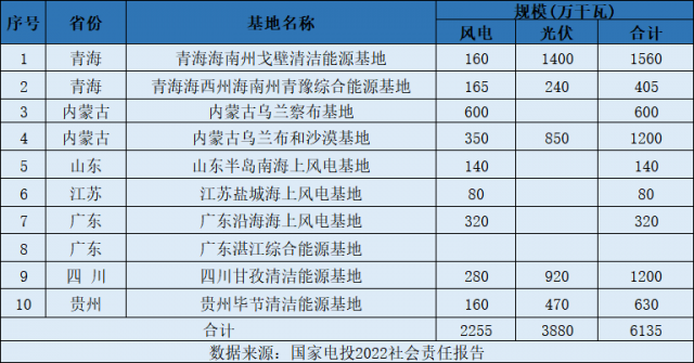 國(guó)家電投2022年社會(huì)責(zé)任報(bào)告顯示,國(guó)家電投獲得了十大新能源基地的開(kāi)發(fā)權(quán),其中包括,內(nèi)蒙古烏蘭布和沙漠基地,規(guī)模共計(jì)1200萬(wàn)千瓦。