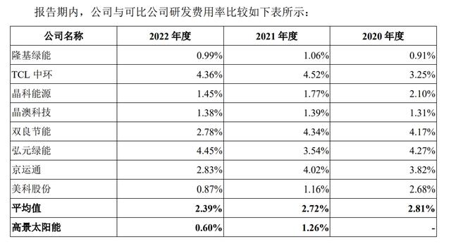 但高景太陽能與同行相比,研發(fā)投入占營收比例較低。招股書數(shù)據(jù)顯示,2020年,高景太陽能未發(fā)生研發(fā)費用。2021-2022年,高景太陽能研發(fā)費用分別約3143.15萬元、1.06億元,占當(dāng)期營收比重僅為1.26%和0.6%。作為光伏產(chǎn)業(yè)鏈企業(yè),研發(fā)費用過低或?qū)⒂绊懝竞罄m(xù)經(jīng)營潛力。