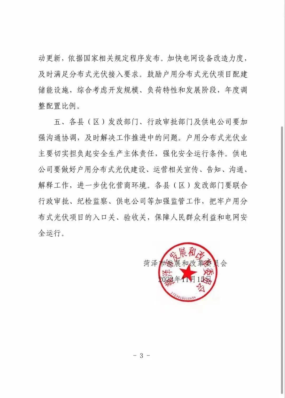 山東菏澤市發(fā)展和改革委員會下《發(fā)關(guān)于進一步推進我市戶用分布式光伏規(guī)范有序發(fā)展的通知》。