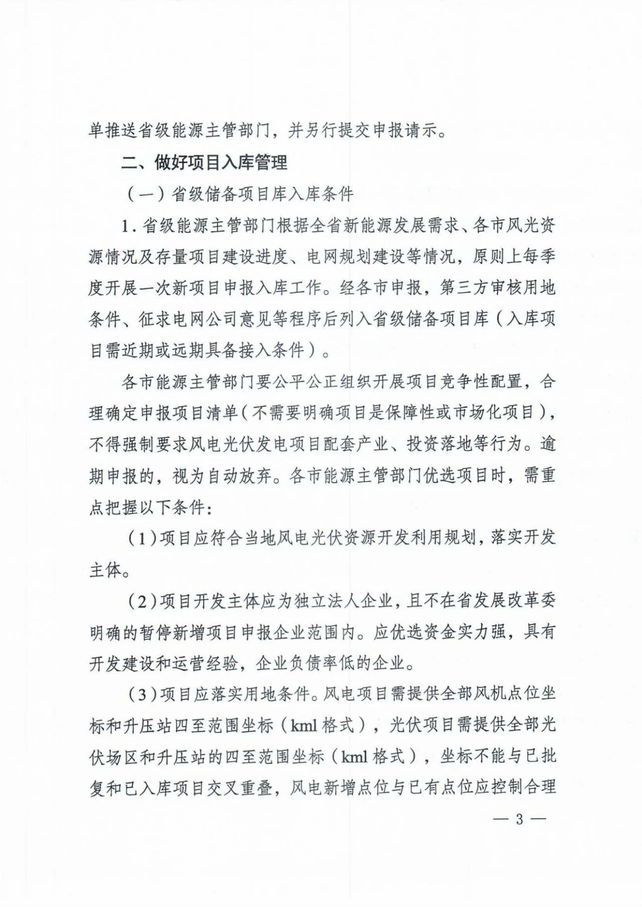 各市需公平開展項目競配,無需確定項目類型,但不得強(qiáng)制要求產(chǎn)業(yè)配套、投資落地等。項目應(yīng)落實用地條件,風(fēng)電項目需提供全部風(fēng)機(jī)點位坐標(biāo)和升壓站四至范圍坐標(biāo)(kml格式),光伏項目需提供全部光伏場區(qū)和升壓站的四至范圍坐標(biāo)(kml格式),坐標(biāo)不能與已批復(fù)和已入庫項目交叉重疊。項目應(yīng)承諾按要求配置儲能等調(diào)峰設(shè)施,入庫時不需要明確配置比例,出庫時按當(dāng)年開發(fā)建設(shè)方案要求配置儲能。