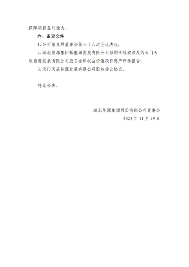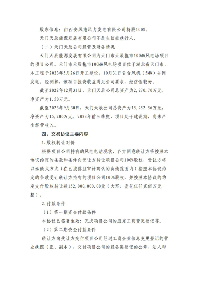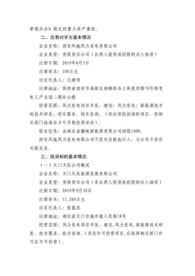 以股權(quán)對價(jià)不超過15,200萬元收購天門天辰能源發(fā)展有限公司100%股權(quán),承接其全部資產(chǎn)及經(jīng)審計(jì)確認(rèn)的負(fù)債,總投資不超過73,852萬元。天門天辰公司為天門市天辰拖市100MW風(fēng)電場項(xiàng)目公司。