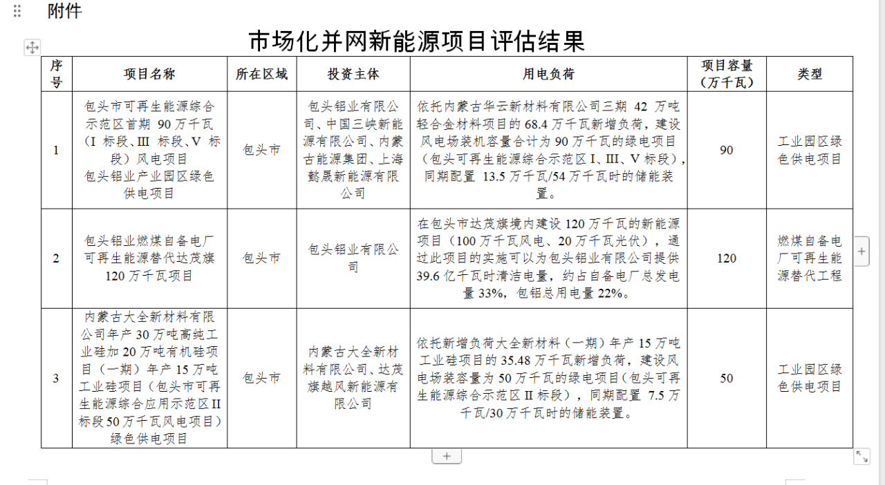 3個項(xiàng)目均納入市場化并網(wǎng)新能源項(xiàng)目清單,共配建新能源規(guī)模260萬千瓦,其中風(fēng)電240萬千瓦、光伏20萬千瓦。分別是:包頭鋁業(yè)有限公司、中國三峽新能源有限公司、內(nèi)蒙古能源集團(tuán)、上海懿晟新能源有限公司聯(lián)合投資的包頭鋁業(yè)產(chǎn)業(yè)園區(qū)綠色供電項(xiàng)目,項(xiàng)目容量90萬千瓦;2.包頭鋁業(yè)有限公司投資的包頭鋁業(yè)燃煤自備電廠可再生能源替代達(dá)茂旗120萬千瓦項(xiàng)目;3.內(nèi)蒙古大全新材料有限公司、達(dá)茂旗越風(fēng)新能源有限公司聯(lián)合投資的“內(nèi)蒙古大全新材料有限公司年產(chǎn)30萬噸高純工業(yè)硅加20萬噸有機(jī)硅項(xiàng)目(一期)年產(chǎn)15萬噸工業(yè)硅項(xiàng)目(包頭市可再生能源綜合應(yīng)用示范區(qū)II 標(biāo)段50萬千瓦風(fēng)電項(xiàng)目)綠色供電項(xiàng)目”。