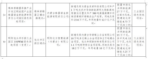 (四)明陽包頭市石拐工業(yè)園區(qū)350WM綠色供電項(xiàng)目。此本項(xiàng)目為變更項(xiàng)目,新增負(fù)荷內(nèi)蒙古華商稀土合金有限公司10萬噸多元稀土合金項(xiàng)目和2萬噸硼合金項(xiàng)目、包頭和順新材料有限責(zé)任公司1.1萬噸特種特合金項(xiàng)目等,用電負(fù)荷為18.2萬千瓦,年用電量10億千瓦時(shí)。配置市場(chǎng)化并網(wǎng)新能源35萬千瓦,其中風(fēng)電15萬千瓦、光伏20萬千瓦,配建電化學(xué)儲(chǔ)能5.25萬千瓦/4小時(shí)。