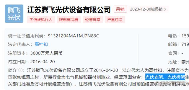 公開資料顯示,江蘇騰飛光伏設(shè)備有限公司于2016年注冊成立,距今已有8年時間。騰飛光伏主營業(yè)務(wù)為生產(chǎn)光伏組件,其中包括光伏支架、光伏橋架等產(chǎn)品的生產(chǎn)和銷售。有接近騰飛光伏的知情人士表示,騰飛光伏并非名不見經(jīng)傳的小工廠,而是曾位列全球出貨量前十的光伏組件工廠,2022年,騰飛光伏年產(chǎn)能高達(dá)20GW,生產(chǎn)的光伏組件熱銷歐洲、美洲、東南亞等。