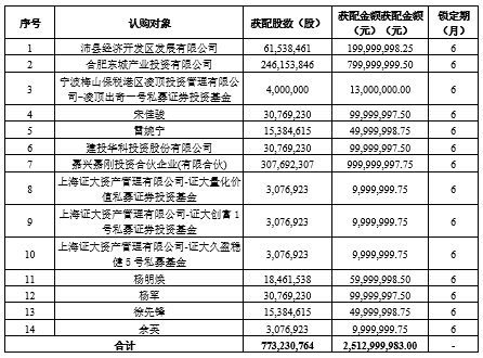 公告顯示,本次發(fā)行對象最終確定為 14 家,最終確定本次非公開發(fā)行的發(fā)行對象與獲配數(shù)量如下: