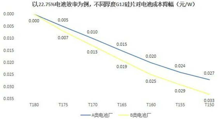 在成本核算上,依據(jù)上述效率測算條件,應(yīng)用160μm硅片的電池,每片成本降幅為0.025元/W。