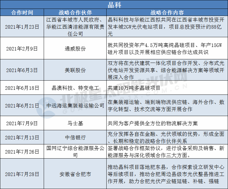 據(jù)北極星太陽能光伏網(wǎng)不完全統(tǒng)計,2021年初至今,已有晶科、通威、晶澳、特變電工、天合光能5家光伏企業(yè)在通過增資入股、合資擴產(chǎn)形式成為深度戰(zhàn)略合作伙伴。