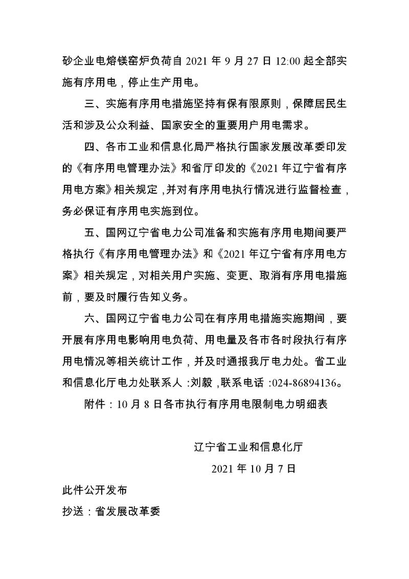 根據(jù)電力供需平衡預(yù)測(cè),10月8日遼寧省最大電力缺口為462萬千瓦,依據(jù)國家發(fā)改委《有序用電管理辦法》,為嚴(yán)重缺電II級(jí)橙色預(yù)警。決定10月8日0:00-5:00限制電力97萬千瓦,5:00-8:00限制電力395萬千瓦,8:00-11:00限制電力275萬千瓦,11:00-15:00限制電力210萬千瓦,15:00-21:00限制電力462萬千瓦,21:00-22:00限制電力222萬千瓦,22:00-24:00限制電力274萬千瓦。