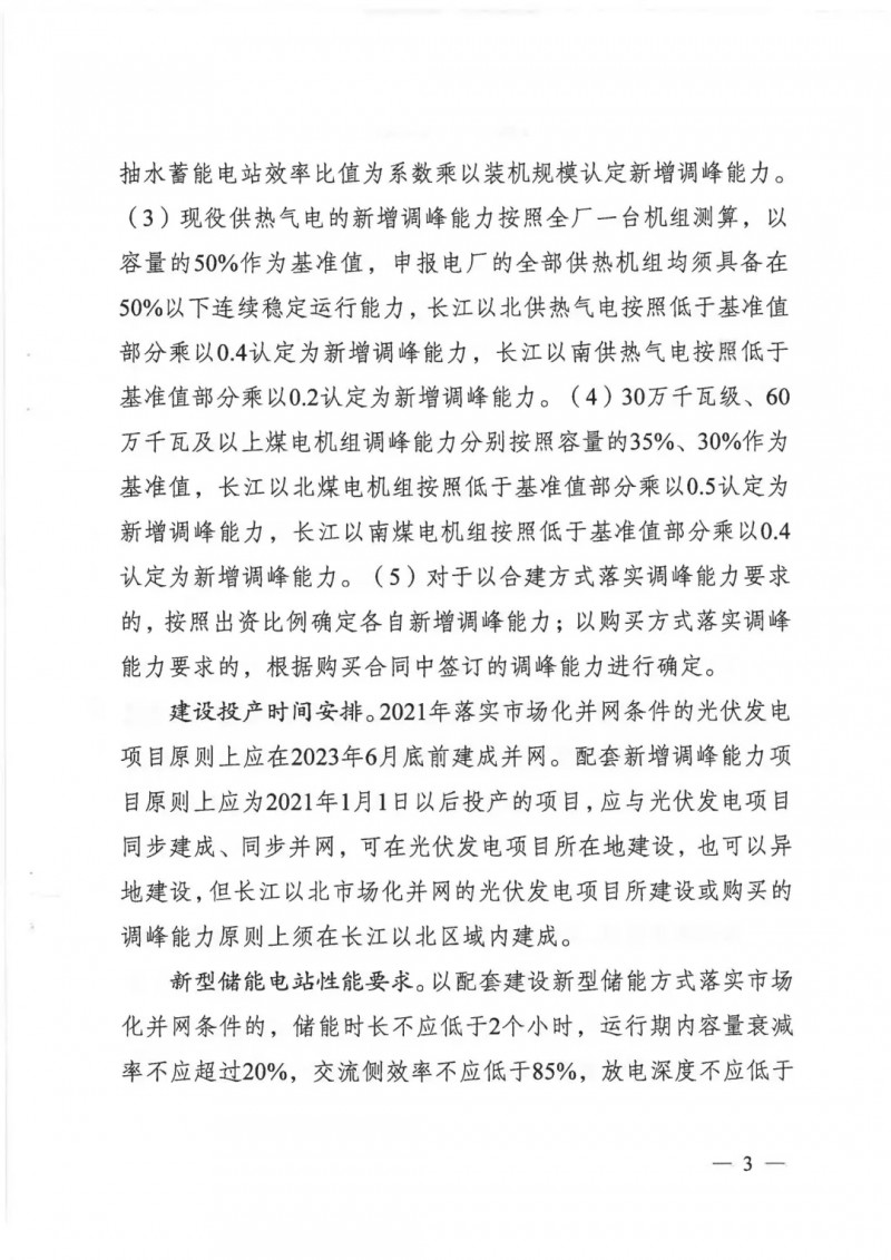 根據(jù)文件,2021年江蘇省長江以南地區(qū)新建光伏發(fā)電項目原則上按照功率8%及以上比例配建調(diào)峰能力(時長2小時,下同),長江以北地區(qū)原則上按照功率10%及以上比例配建調(diào)峰能力;調(diào)峰能力超過規(guī)定比例的,剩余部分可在江蘇省范圍內(nèi)統(tǒng)籌并通過市場化方式交易給其他發(fā)電企業(yè)。