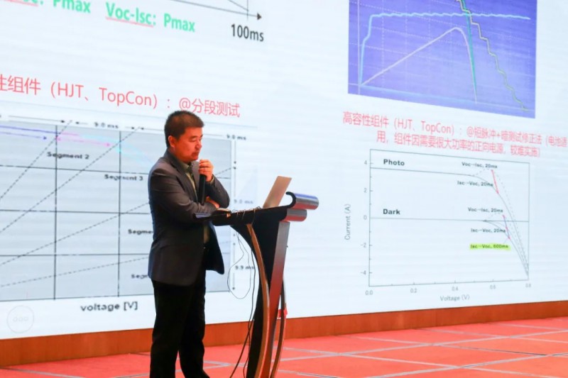 北京德雷射科光電有限公司總經(jīng)理林慧軍,作了《高容性太陽(yáng)電池組件I-V測(cè)試最新研究》的報(bào)告,分析了當(dāng)前高容性太陽(yáng)電池組件I-V測(cè)試的現(xiàn)狀,然后針對(duì)光伏產(chǎn)品“容性高,測(cè)不準(zhǔn)”的行業(yè)痛點(diǎn),展示了該公司所做的技術(shù)工作及取得的重大成果。